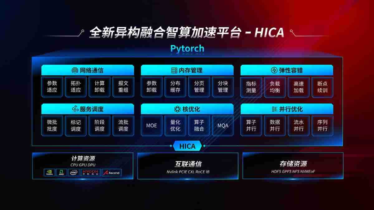 通过自研的服务层、、、、中间适配层、、以及调度编排算法,,采用数据并行、、、模型并行等多种并行方式,,把并行计算任务进行有效的分解,,使其分别由相应的软件栈和算力资源来承接。。当GPU资源变化,,HICA可以实时动态调度计算子任务并调整模型拓扑和架构,,,,以充分聚合各种算力资源。。。