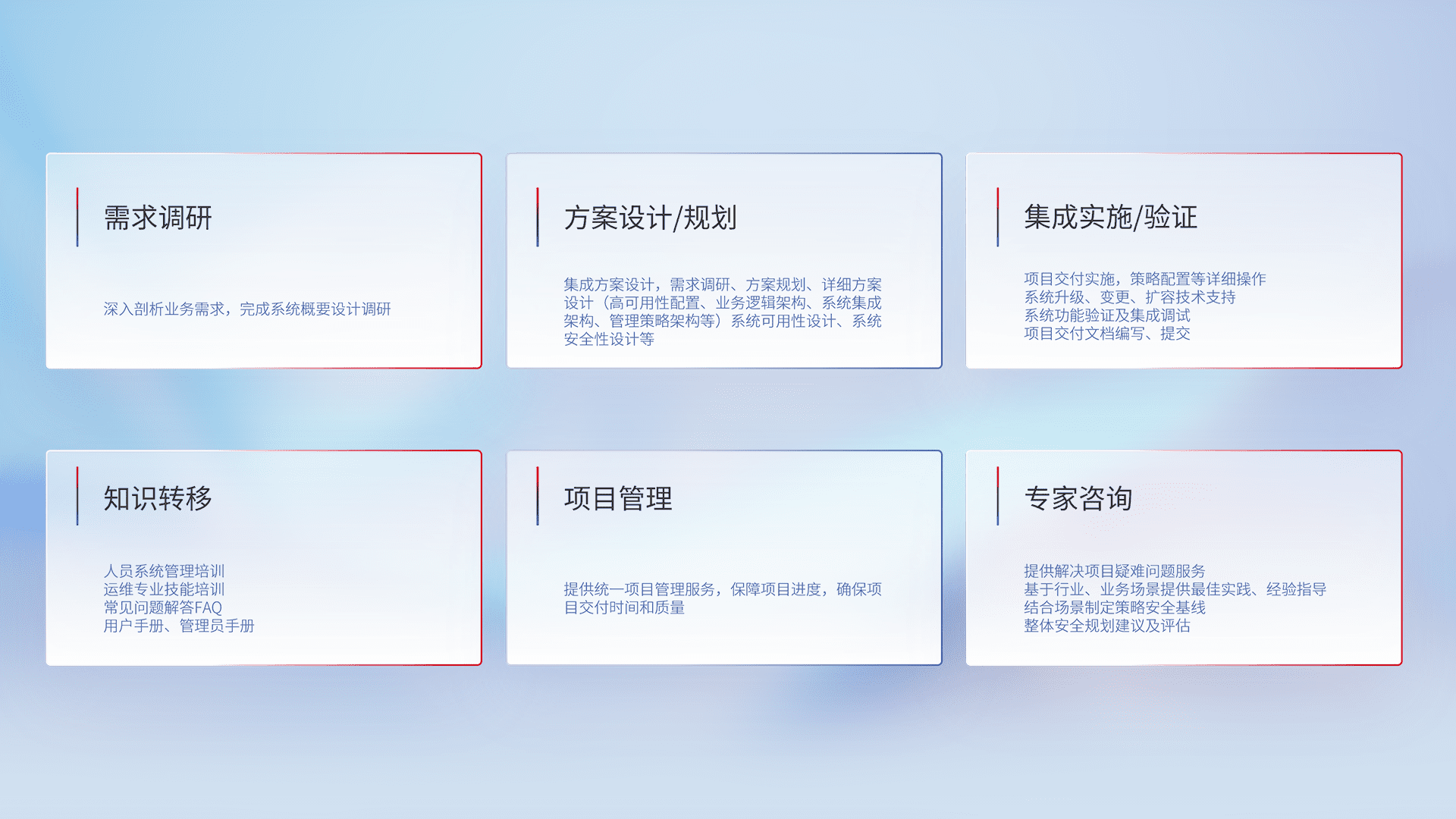 针对客户行业特性,,,,将宏观的安全战略和需求,,通过专业的交付服务,,,实现项目落地,,,,为客户提供标准规范的集成交付服务。。。。